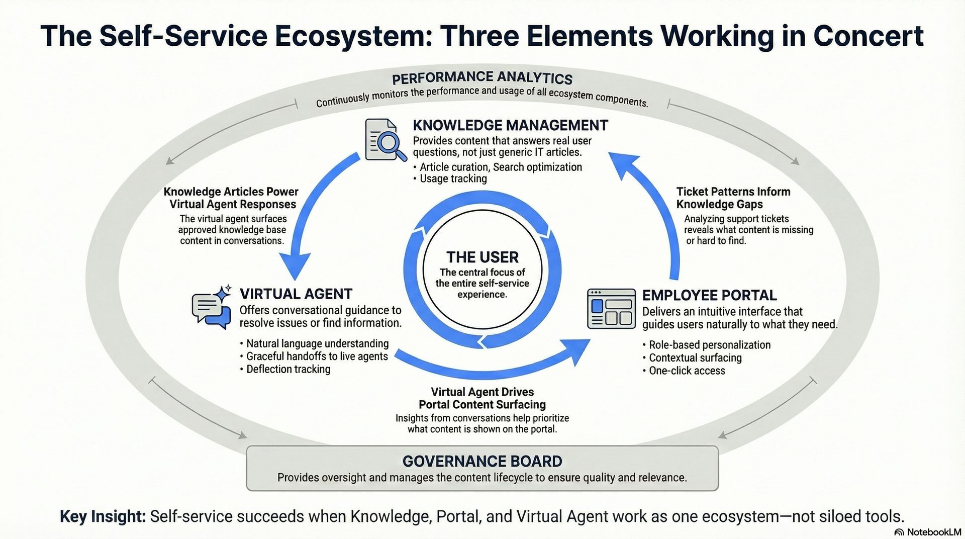 Strategic self-service isn't about forcing users to 'find it themselves'. It's about making self-service the fastest path to resolution. This means architecting Knowledge Management for find-ability, configuring the Employee Portal for intuitive navigation, deploying Virtual Agent for conversational guidance, and using Performance Analytics to track what's working.