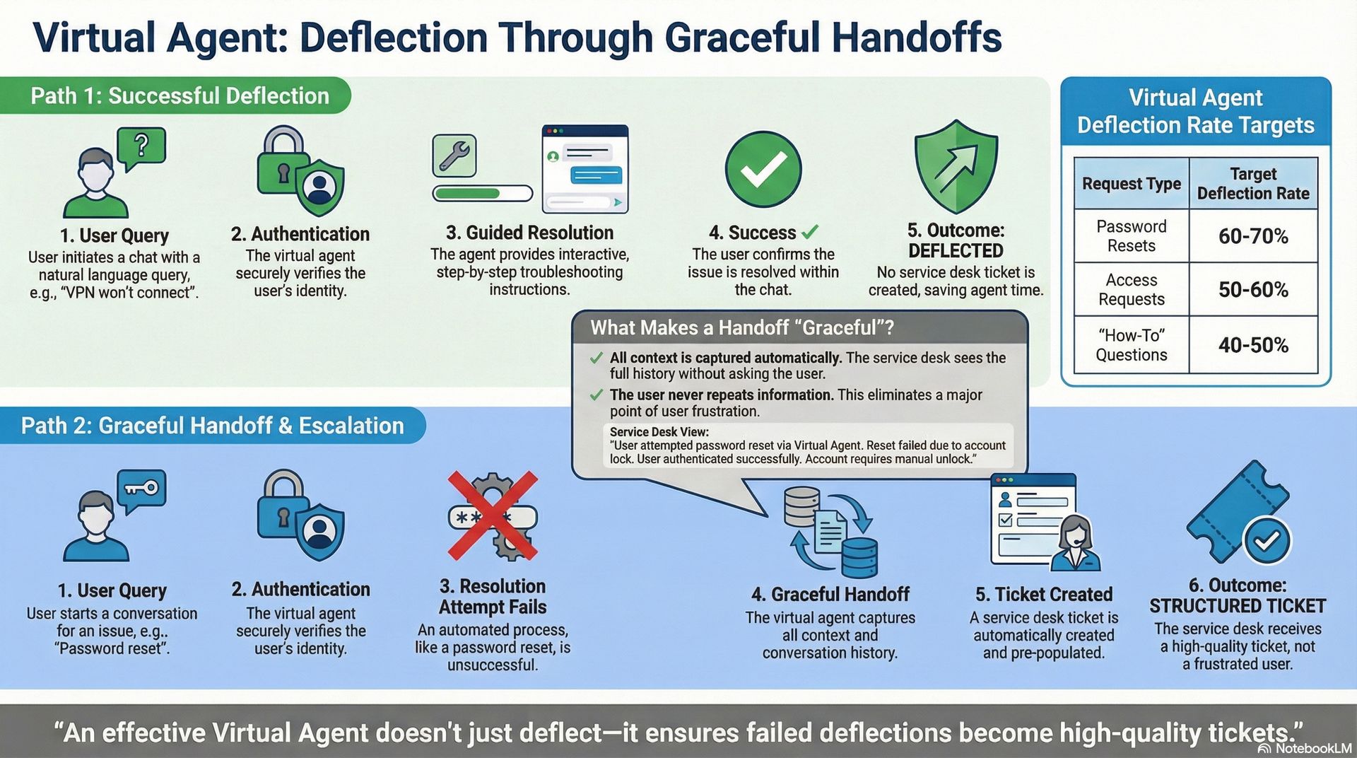 Implement graceful handoffs. When Virtual Agent can't resolve an issue, it should create a ticket automatically with all context captured. Users shouldn't have to repeat information. The Service Desk Analyst should receive a ticket that says; 'User attempted password reset via Virtual Agent. Reset failed due to account lock. User authenticated successfully. Account requires manual unlock.'