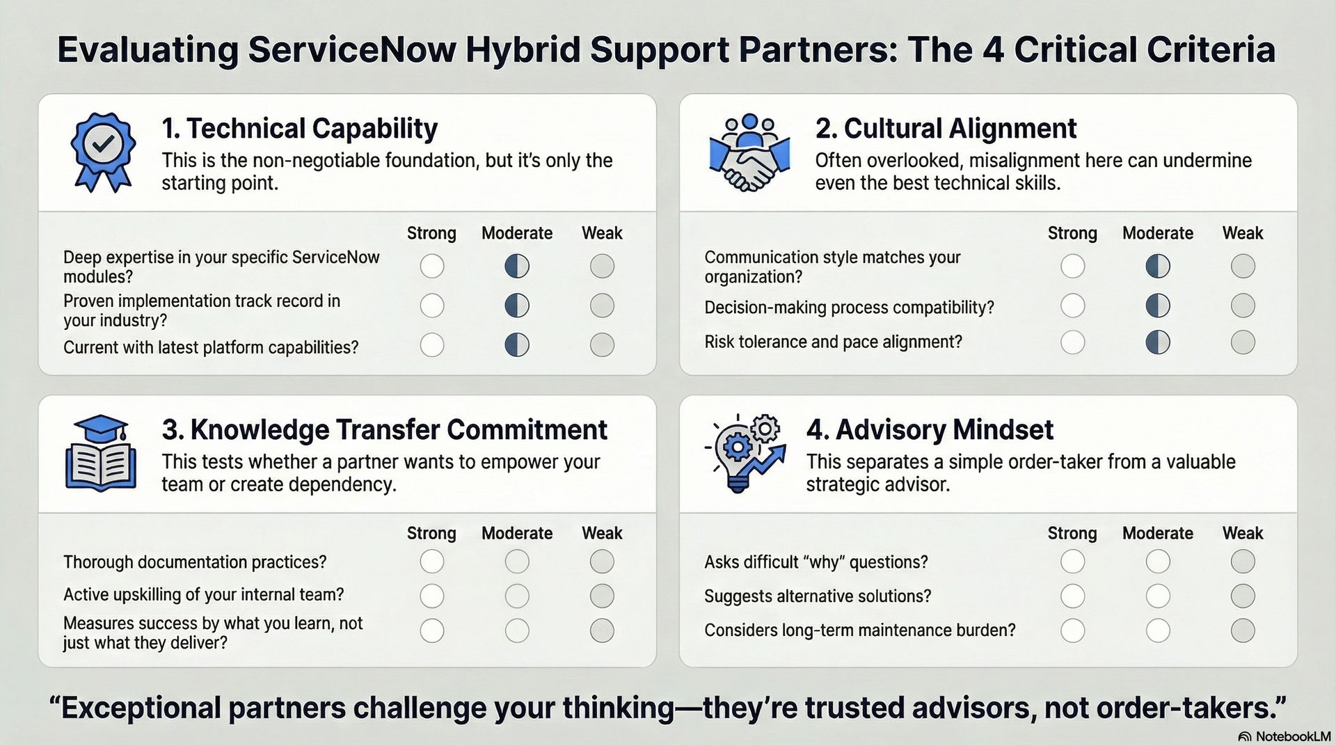 Technical capability is table stakes. Your partners must demonstrate genuine expertise in the specific ServiceNow modules you're using. But here's what separates adequate partners from exceptional ones: they should challenge your thinking, not just execute your requirements.