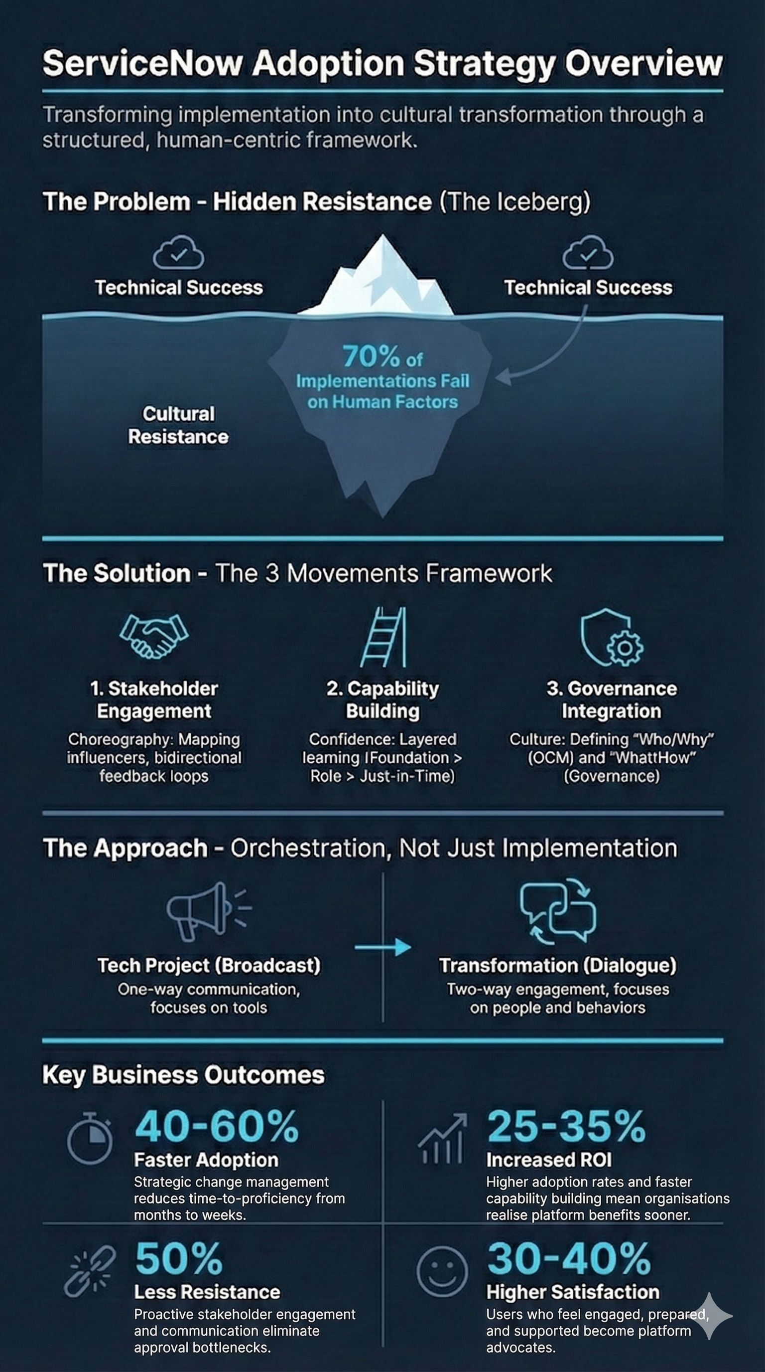 A complete framework for ServiceNow success: transforming cultural resistance into momentum through engagement, capability, and governance.