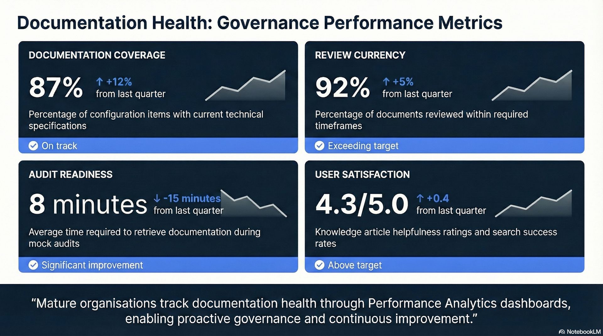 Your Governance Board establishes documentation standards and reviews compliance quarterly. They define what constitutes adequate documentation for different change types, specify review requirements, and set quality thresholds. But governance doesn't stop at policy creation, it extends to active oversight.