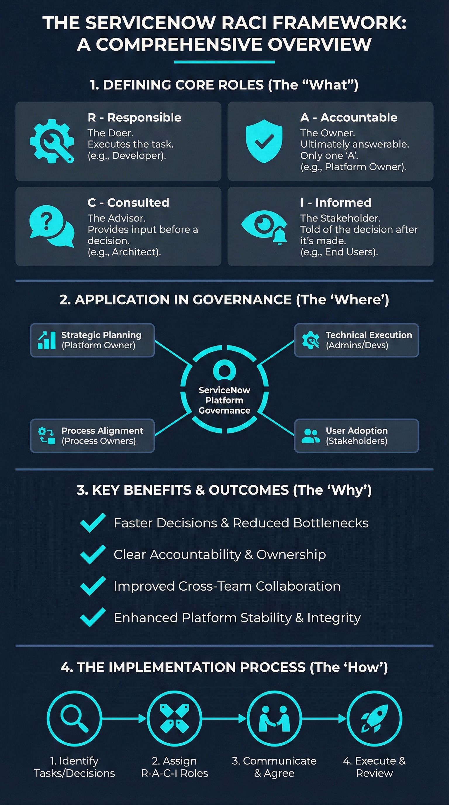 Within ServiceNow teams, this framework becomes indispensable. Whether you're a Platform Administrator managing daily operations, a Platform Owner steering strategic direction, or an Executive Sponsor ensuring enterprise alignment, RACI provides the clarity that transforms good intentions into consistent execution.